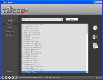 O buscador do tBear Music realiza a procura nas bases do GoEar e do ListenGo e traz o resultado na própria janela. Dê dois cliques sobre o nome da música e o som começa a sair imediamente. O tBear Music inclui um reprodutor de áudio básico.